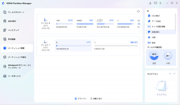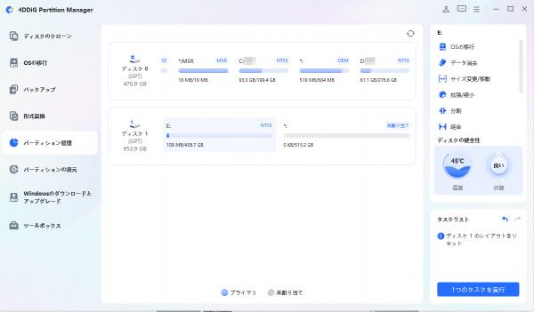 また、パーティション変更だけでなく、ディスク管理やクローン作業までまとめて行いたい方には、4DDiG Partition Manager がおすすめです。2025年12月23日(火)時点で最新版では、初心者でも直感的に操作できる設計で、数クリックで安全かつスムーズにパーティション管理を進められる点が特長です。
