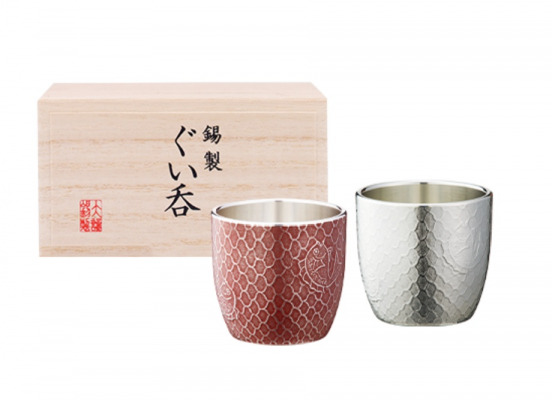 【大阪錫器】 錫製 ぐい呑 鯛網 紅白ペア 55ml