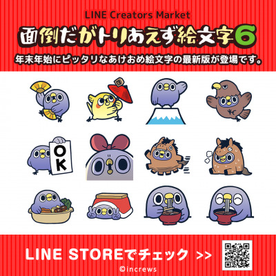 今後もLINEスタンプだけでなく、LINE着せかえやLINE絵文字に加え、「カワセル」及び「カワセルくじ」や「インクルーズプリント」でのフィジカルグッズ化など幅広く展開しますので、「面倒だがトリあえず返信」から生まれた株式会社インクルーズのオリジナルIPでもある「めんトリ」をトリあえず応援の程、宜しくお願い致します。