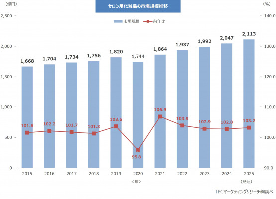 ◆2024年のサロン用化粧品市場は、前年比2.8%増の2,047億円で推移している。同市場は、2020年に新型コロナウイルスの影響を受けて規模が縮小したものの、2021年には急激な需要増により市場が回復。その後は、緩やかな成長をみせている。