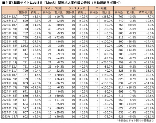 「MaaS」の関連求人案件数(主要転職4サイト)は2025年12月末時点で、前月比3.0%増、前年同月比7.7%減の762件となりました。