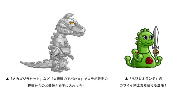 期間中「大怪獣のアバたま」に「メカゴジラ」「ビオランテ」「ファイヤーラドン」をモチーフとした城ドラキャラの激レアお着替えや、コラボ限定の剣士お着替え「ちびビオランテセット」がコラボ限定で登場します。さらに、前回登場した「シン・ゴジラ」などのお着替えも復刻登場いたします!そのほか、レア城主イベントやSP討伐イベントなど、コラボ期間限定のイベントも実施いたしますので、1月16日(金)からのコラボ開催に是非ご参加ください。