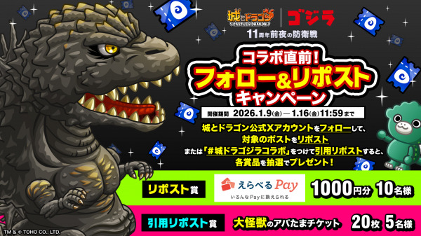 1月16日(金)より『城とドラゴン』11周年間近のスペシャルイベント、『ゴジラ』とのコラボイベントを復刻開催することが決定いたしました。今回は大怪獣に扮した城ドラキャラの激レアお着替えが『城とドラゴン』に登場するほか、「ちびゴジラ」たちのカワイイ剣士お着替えも登場!また1月9日(金)からは公式Xにて「コラボ直前!フォロー&リポストキャンペーン」がコラボに先駆けてスタートいたします。キャンペーンへのご参加お待ちしております!