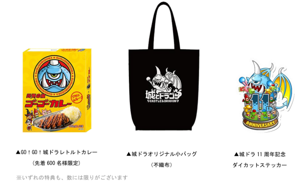 ※無償5,000ルビーと「GO!GO!城ドラレトルトカレー」はイベント会場へのご来場時に順次配布いたします