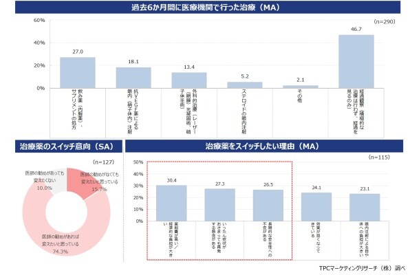 ◆また、現在の治療薬のスイッチ意向がある人は9割に達し、医師の勧めがあった場合にスイッチしたい人が大部分を占めた。理由としては、薬剤費が高いこと、いったんおさまっても再発する懸念があること、長期的な安全性への不安があることなどが上位に挙げられている。