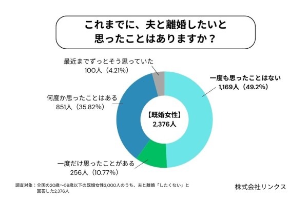 第2報では、現在は「離婚したくない」と考えている女性2,376人を対象に、「これまでに離婚を考えたことがあるか」、そして「夫と結婚を決めた理由」を調査しました。