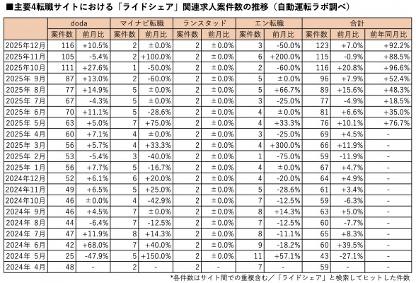 主要転職4サイトにおけるライドシェアの関連求人案件数(※「ライドシェア」と検索してヒットした求人)は2025年12月末時点で前月比7.0%増、前年同月比92.2%増の123件となりました。