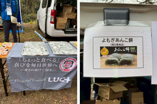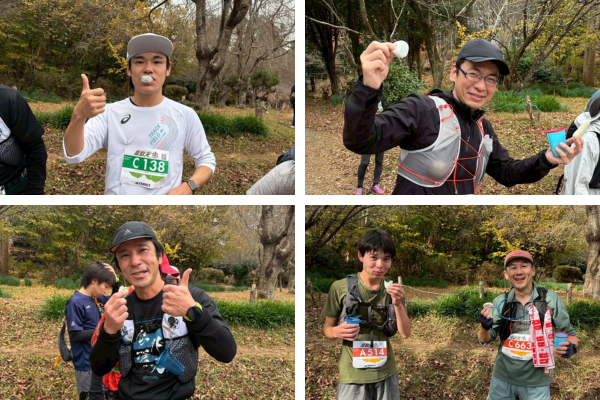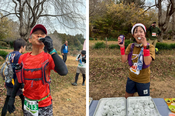 種類豊富で充実したエイドステーションで、明日香野は「よもぎあんこ餅」「和sweets ごま餅」をお渡し。ゴール後に振る舞われた豚汁などとともに、多くのランナーから喜んでいただけました。
