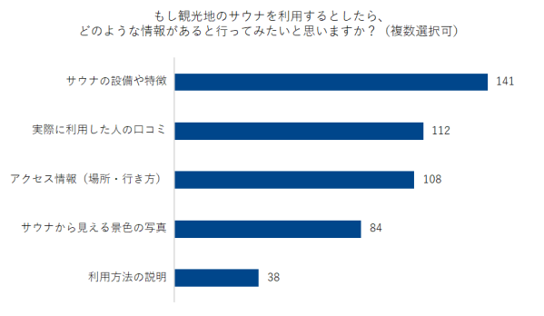 「サウナの設備や特徴」141人、「実際に利用した人の口コミ」112人、「アクセス情報(場所・行き方)」108人、「サウナから見える景色の写真」84人、「利用方法の説明」38人でした。