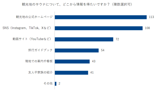 観光地のサウナの情報をどこから入手したいかたずねたところ、最も多かったのは「観光地の公式ホームページ」で113人でした。次いで、「SNS(Instagram、TikTok、Xなど)」108人、「動画サイト(YouTubeなど)」72人、「旅行ガイドブック」54人、「現地での案内や看板」43人、「友人や家族の紹介」41人、「その他」2人と続きます。