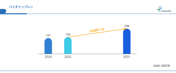 LP Informationの最新レポート「世界バイオイソプレン市場の成長予測2025~2031」(https://www.lpinformation.jp/reports/43566/bio-isoprene)によれば、2025年~2031年のグローバル市場CAGRは7.1%で、2031年には市場規模が2.98億米ドルへ到達すると見込まれ、初期段階でありながら需要が急速に顕在化していることがうかがえる。特に、単一材料にもかかわらず市場全体の成長率が極めて高い点は、用途分野がタイヤ・エラストマー・医療材料など複数にまたがり、同時に採用検討が進んでいる可能性を示唆する。つまり、この市場は単純な代替材料ではなく、複数バリューチェーンに跨るマルチアプリケーション型の成長ポテンシャルを有する点が構造的特徴である。