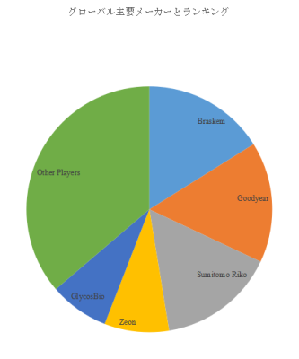 バイオイソプレン市場は、Braskem、Goodyear、Sumitomo Rikoといった世界的企業が中核を担う構造を形成している。LP Informationのトップ企業研究センターによれば、2024年時点で上位3社が売上ベースで約47.0%の市場シェアを占めており、技術開発力と製品化スピードを軸とした競争が加速している。これら企業は、各社の年報においてサステナブルマテリアルへの投資強化を明確化しており、供給体制の拡充と事業ポートフォリオの高度化を継続的に示している。特に、既存のエラストマー事業を基盤とする企業ほど、バイオベースモノマーの導入による製品差別化を戦略的に位置づけており、今後の市場成長を主導する重要プレイヤーとして存在感を高めている。