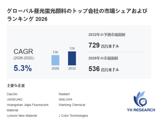 YH Researchによるとのグローバル昼光蛍光顔料の市場は2025年の493百万米ドルから2032年には729百万米ドルに成長し、2026年から2032年の間にCAGRは5.3%になると予測されている。