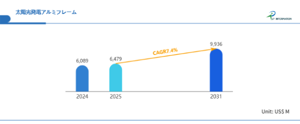 LP Informationの調査レポート「世界太陽光発電アルミフレーム市場の成長予測2025~2031」(https://www.lpinformation.jp/reports/195026/aluminum-frames-for-solar-pv)によれば、太陽光発電アルミフレーム市場は2025年から2031年にかけて年平均成長率(CAGR)7.4%で拡大し、2031年には99.36億米ドル規模に達すると予測されている。脱炭素社会に向けた世界的な政策加速、エネルギー安全保障の重要性増大、さらに新興国市場における太陽光発電需要の急増が、この成長を下支えする主要な要因である。特に欧州や中国では再生可能エネルギー投資の拡大が続いており、アルミフレーム需要の中長期的な拡大を確実なものとしている。さらに、アルミニウム価格の変動や炭素排出抑制策が市場動向に影響を与える中で、製造技術の進化とサプライチェーン最適化が企業競争力の核心を成す局面を迎えている。