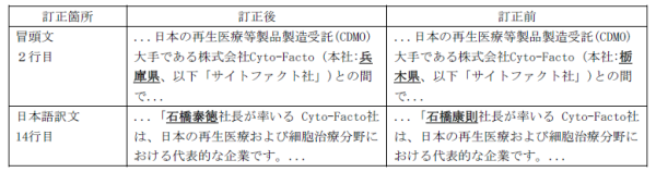 2026年1月16日付で開示いたしました「当社出資先(Steminent Biotherapeutics Inc.)と株式会社Cyto-Factoとの基本合意書締結に関するお知らせ」に、一部訂正がございますのでお知らせいたします。訂正箇所には下線を付しております。配信元企業:株式会社リプロセルプレスリリース詳細へドリームニューストップへ