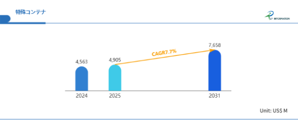 LP Information調査チームの最新レポート「世界特殊コンテナ市場の成長予測2025~2031」(https://www.lpinformation.jp/reports/597405/specialty-shipping-containers)によると、2025年から2031年の間に、特殊コンテナ市場は年平均7.7%の成長率を示し、2031年には約76.58億米ドルにまで市場規模が拡大すると予測されている。この成長は、高度化・多様化する物流ニーズに加え、グローバルサプライチェーンの複雑化が背景にある。