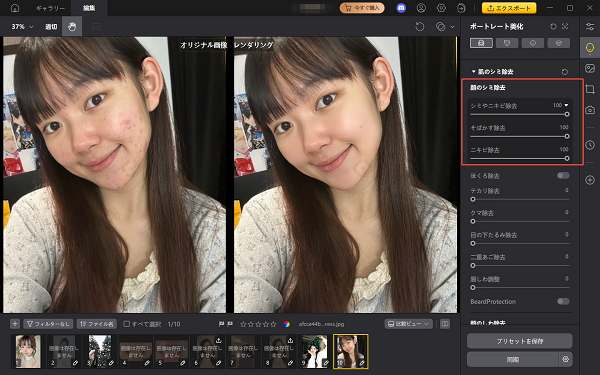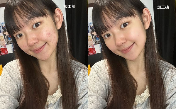 ・ワンクリックで自然にニキビを消す:ブラシ操作や細かな調整は不要。AIが必要な部分だけを判断し、過剰にならない美肌補正を実現します。