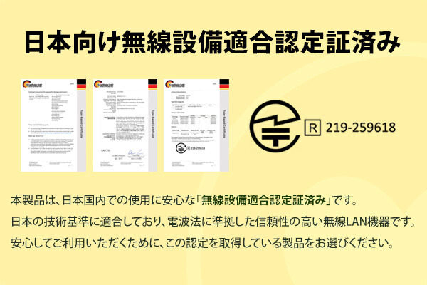 日本の電波法に適合した技適認証を取得。法人利用や公共施設でも安心して導入いただけます。