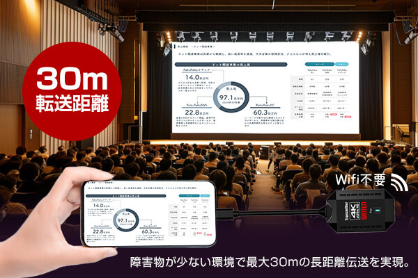 本製品は、USB-C接続に対応し、パソコンやスマートフォン、各種映像機器の画面を、ケーブル不要でディスプレイやプロジェクターへ出力できるワイヤレスHDMI送受信機です。ドライバーのインストールは不要で、機器を接続するだけですぐに使用可能。会議、プレゼンテーション、教育現場、イベント運営など、幅広いシーンで快適な映像共有を実現します。
