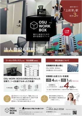 株式会社アルファポイント(所在地:愛知県名古屋市中区大須3丁目30-40 万松寺ビル10F 代表取締役:丸山和之、以下アルファポイント)は、同所在地の9Fにて、「集中と創造のための都市型個室オフィス」をコンセプトとした新サービスとなる「OSU WORK BOX」を2026年1月20日(火)より開始しました。