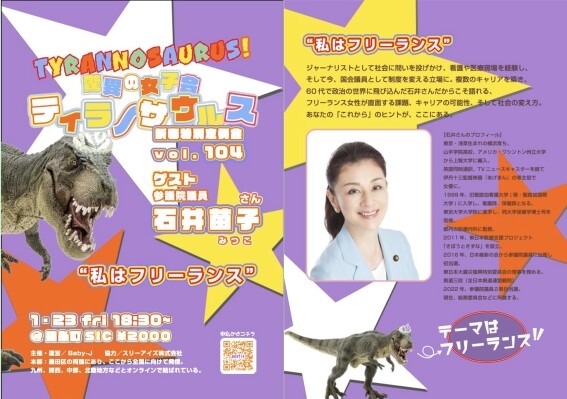 フリーランスという働き方は、組織に属さない選択であると同時に、社会とどう関わるかを自ら引き受ける生き方でもあります。「驚異の女子会ティラノサウルス」は、メディア、看護・医療、政治を横断したキャリアを持つ石井苗子(いしい・みつこ)氏をゲストに迎え、参加者からの質問を軸に進行する対話型イベント「私はフリーランス」を開催します。