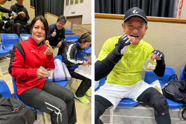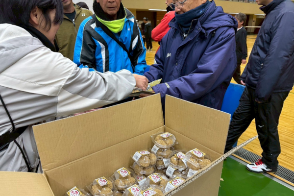 明日香野は各ペアに「和sweets ごま餅(3個入)」をお渡ししました。素早くエネルギーとなる和菓子は試合前や試合の合間に活躍。選手の皆さまの糖分補給に役立てていただけました。