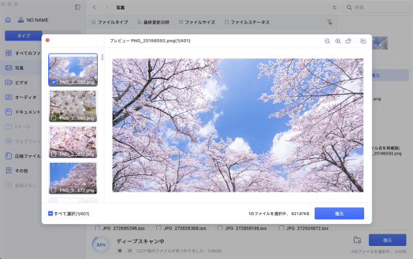 ステップ2.Macゴミ箱から削除されたデータを全てスキャンするのには時間がかかります。スキャン結果が出ましたら、詳細をプレビューするためにお探しのファイルタイプをクリックすることができるようになります。