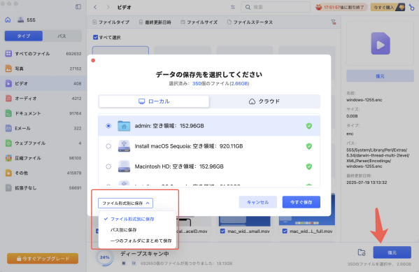 ステップ3.復元したファイルの保存場所を選択して、MacローカルまたはGoogleドライブに保存します。
