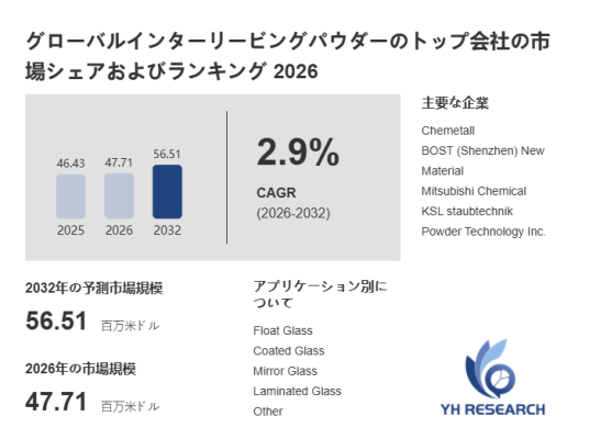 YH Researchによるとのグローバルインターリービングパウダーの市場は2025年の46.43百万米ドルから2032年には56.51百万米ドルに成長し、2026年から2032年の間にCAGRは2.9%になると予測されている。