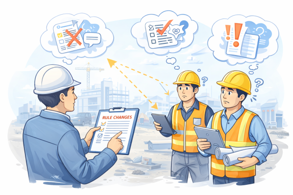 建設現場では、現場条件や施工計画の変更、協力会社の入れ替わり、使用する資材・工法の変更などにより、ルールや手順が更新される場面が珍しくありません。加えて、建設業では2024年4月1日以降、時間外労働の上限規制(罰則付き)が適用されており、限られた時間の中で教育・周知を回す必要も増しています。