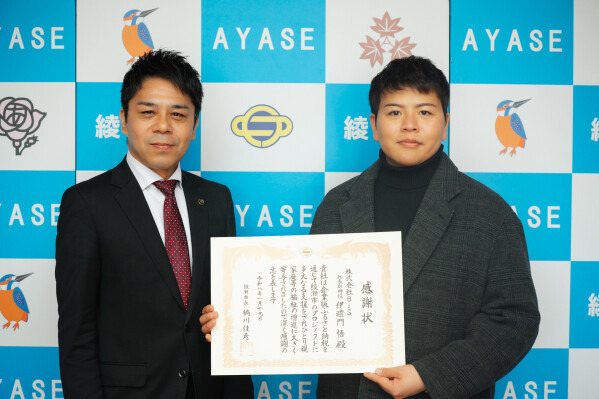 この取り組みに対し、2026年1月19日、伊禮門は綾瀬市長 橘川佳彦様より感謝状をいただきました。