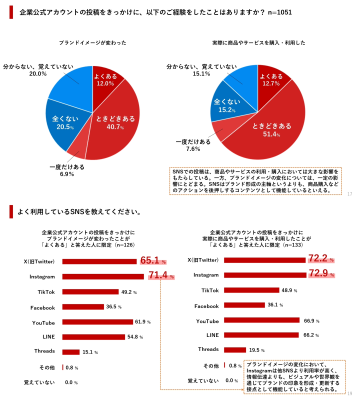 SNS投稿をきっかけとした行動について、「実際に商品やサービスを購入・利用した」経験が「よくある(12.7%)」または「ときどきある(51.4%)」と回答した人は、合計で6割を超えています。一方、ブランドイメージの変化については一定の影響にとどまっており、SNSは購入アクションを後押しするコンテンツとして機能しているといえます。
