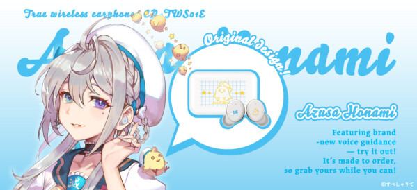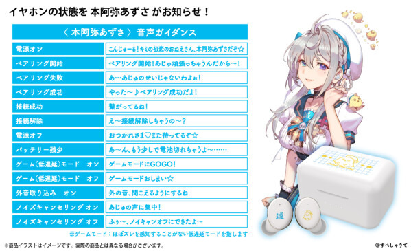 本コラボレーションモデルは、左右のイヤホンや充電ケースに「β郎」や「滅」を本体にあしらい、白を基調とした普段使いがしやすい商品となっております。また内蔵されているボイスは完全録り下ろし(全13ワード)です。パッケージには、本コラボレーションモデルのために撮り下ろされた「本阿弥あずさ」のビジュアルを採用しています。