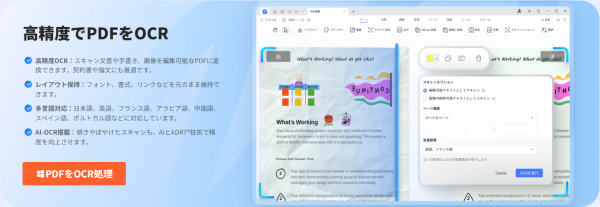 特に印象的だったのが、スキャン書類に対するOCR機能です。文字認識の精度が高く、元のレイアウトをほぼ維持したままテキスト化できるため、修正や再利用が非常にしやすいと感じました。