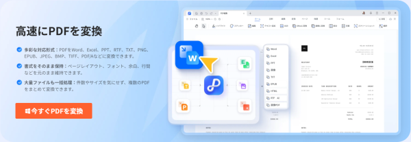 Word・Excel・PowerPointなどのOfficeファイルや、画像ファイルとPDFの相互変換に対応しています。
