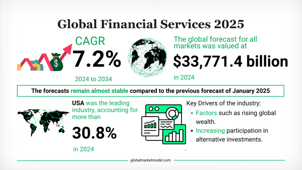 二〇二五年七月のグローバル・マーケット・モデル予測は、世界の金融サービス産業が引き続き拡大していることを示しています。デジタルトランスフォーメーションの加速、代替投資への参加拡大、そして地域を超えた金融商品へのアクセス向上が成長を後押ししています。規制監督の強化や地政学的な不安定性が事業環境を再形成する一方で、金融仲介機能とイノベーションに対する構造的需要は依然として強固です。