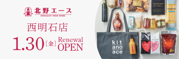 北野エースは、全国の百貨店を中心に100店舗以上を展開する食料品専門店です。地元の食品をはじめ、デイリーからギフト商品、さらには輸入食材まで、圧倒的な品揃えで「発見する楽しさ」や「選ぶよろこび」をお届けします。この度リニューアルオープンする「北野エース 西明石店」は、新幹線駅としても利用されるJR西明石駅直結の商業施設「PLICO西明石」の1階に店舗を構えています。2007年のオープンから長らく多くのお客様にご愛顧いただいてきました。北野エースが各地のメーカーとタイアップで開発・製造をするプライベートブランド“キタノセレクション”など定番商品のほか、駅直結の店舗らしく明石土産や酒類、お菓子など、旅のおともにもおすすめの食料品を取扱います。西明石店では、バイヤーが市場から買い付ける新鮮な野菜・果物も取り扱います。野菜・果物を販売している北野エースは、全国で2店舗(西明石店、垂水店)のみ。