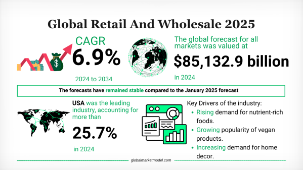 同業界は2024年に8兆5,132.9億ドル規模に達し、2034年まで年平均成長率(CAGR)6.9%で拡大すると見込まれており、小売・卸売は引き続き世界の消費と経済活動を支える基盤的産業であり続ける。