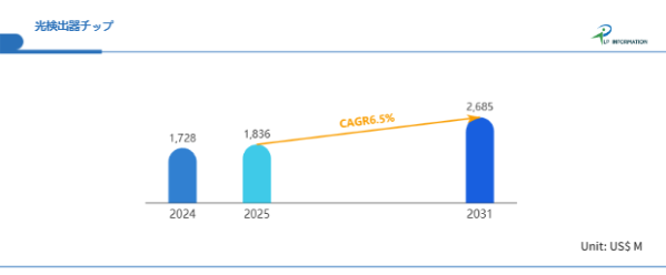 LP Information調査チームの最新レポートである「世界光検出器チップ市場の成長予測2025~2031」(https://www.lpinformation.jp/reports/565376/photoelectric-detector-chip)によると、2025年から2031年の予測期間中のCAGRが6.5%で、2031年までにグローバル光検出器チップ市場規模は26.85億米ドルに達すると予測されている。