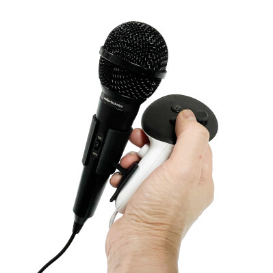 演者の動きがアバターの仕草に緻密に再現されることから、VRヘッドセットを装着してのパフォーマンスは大変重要です。この際、コントローラーとマイクを片手で同時に持たなくてはならず、ゴムでマイクをコントローラーに縛り付けるなど、様々な工夫が行われています。「Vocal Bridge」はこの問題を解決します。