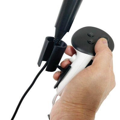 Vocal Bridgeは3Dプリンタで出力された小さなアイテムで、Questコントローラーとマイクを差し込むスロットを有し、コントローラーをグリップするだけでマイクも手に固定されるというもの。