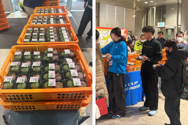 大会が終わって熱戦の余韻に浸り、帰路につく来場者の皆さまに、明日香野は「ちょっと大きめごまとくるみの大福」「THE草餅・道明寺」をお配りしました。手に汗握る激闘が続き、応援にも力が入り、カロリー消費が激しかった今大会。ほどよい甘さの和菓子は糖分補給にもぴったりでした。