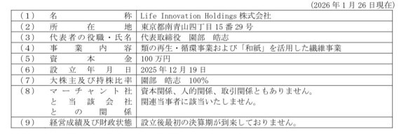 Life Innovation 社とは、2025 年12 月15 日付適時開示資料「Life Innovation Holdings 株式会社との資本業務提携に関する基本合意のお知らせ」のとおり、マーチャント社がLife Innovation 社に15%程度の資本参加を行うにつき、基本合意し、その後、協議を重ねてまいりましたが、単なる投資案件としてではなく、Life Innovation 社が取り組む、和紙繊維事業並びに衣類エネルギ―事業のこれまでの実績や今後の成長可能性に注目し、持分法適用関連会社として、また、将来的に、連結子会社として、マーチャント社グループに取り込みことにより、マーチャント社の企業価値向上に貢献することを期待するものであります。