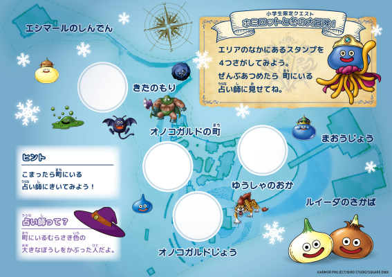本クエストは、アトラクションエリア内に隠された冬限定モンスターのスタンプを探しながら、エリアを巡るスタンプラリー形式のクエストです。大冒険キャンペーン期間中は、ゴールドチケット以上をご購入の方を対象にこれまで小学生限定で開催していた本クエストに、大人の方も参加することが可能となります。また、対象年齢関わらずクエストをクリアされた方には、ホミロットや玉ねぎスライムがデザインされた、ドラゴンクエスト アイランド限定のオリジナルステッカーをお渡しいたします。
