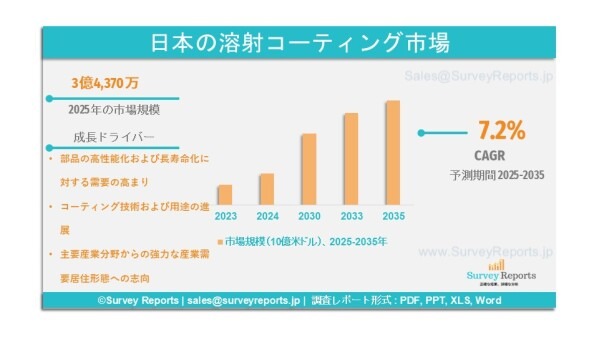 Surveyreportsの専門家による日本の溶射コーティング市場調査の分析によれば、2025年における日本の溶射コーティング市場規模は3億4,370万米ドルであった。さらに、日本の溶射コーティング市場は、2035年末までに6億5,270万米ドルの収益に達すると予測されている。同市場は、2025年から2035年の予測期間中に、約7.2%の年平均成長率(CAGR)で成長すると見込まれている。