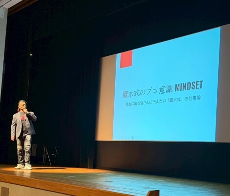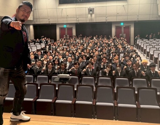 当日は、本校の卒業生であり、新日本プロレスに所属し、トップ戦線で活躍されている鷹木信悟氏を特別講師としてお迎えしました。卒業生というご縁から本イベントの趣旨をお伝えしたところ、後輩の力になりたいとの思いからご快諾いただき、今回の講話が実現しました。