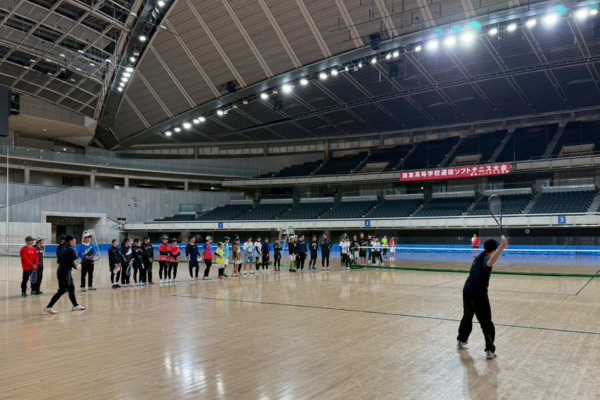 清明学園中学校のソフトテニス部顧問であり、全日本U-17女子監督の高橋茂氏が講師を務め、東京インドアに出場する明治大学の前田梨緒選手、中谷さくら選手がスペシャルゲストに加わりました。また、補助員として清明学園中学校のソフトテニス部の皆さまにもお手伝いいただきました。