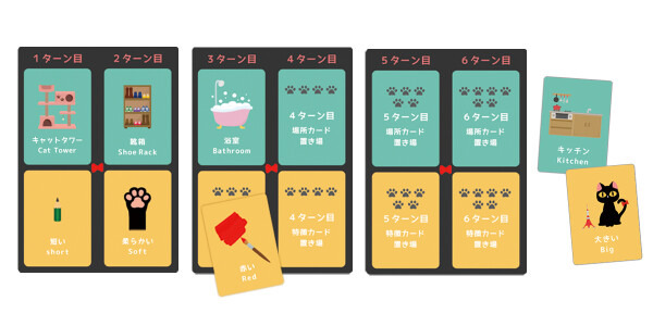 各ラウンドでは、ネコ番が「場所カード」と「特徴カード」を1枚ずつ引き、それを メガネの隠し場所として秘密裏に決定します。