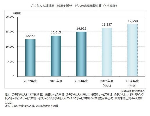 2025年度のデジタル人材採用・活用支援サービスの市場規模(4市場計)は、前年度比8.9%増の1兆6,257億円を見込む。