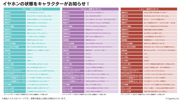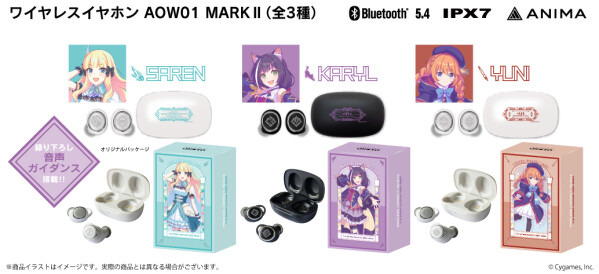 本コラボレーションモデルは「キャル」「サレン」「ユニ」の3モデル。左右ハウジングに各モチーフをレーザー加工、充電ケース天面にキャラ名や作品タイトル入りのモチーフを印刷加工し、各キャラクターの世界観を表現したオリジナルデザインとなっております。「キャル」「サレン」「ユニ」の新規録り下ろしボイスを搭載。電源オンやオフ、ペアリング時やタップ音、ノイズキャンセリングモード時等、それぞれ計24ワードのボイスを楽しめます。